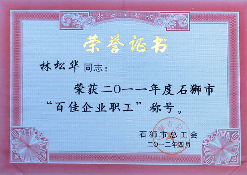 百佳企業(yè)職工榮譽證書