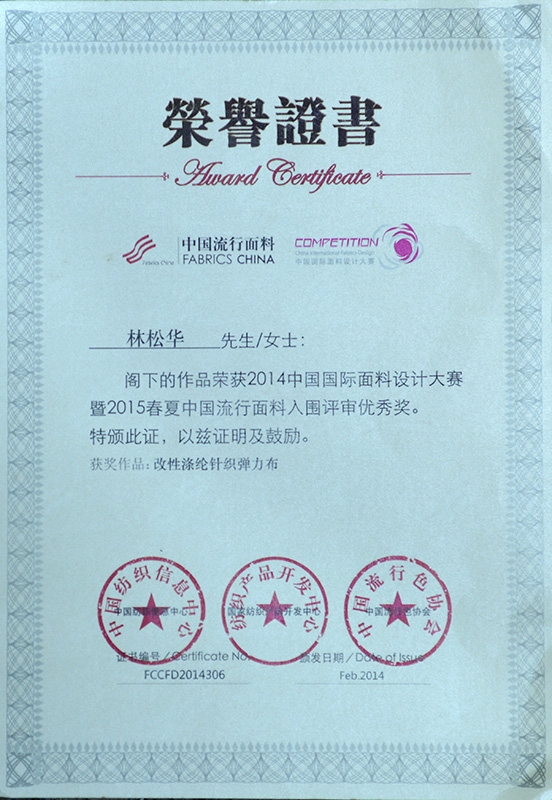 國際面料設計大賽優(yōu)秀獎